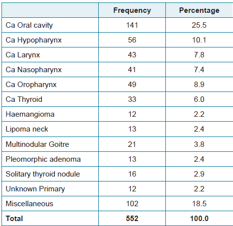 Results: Total of 552 patient data were collected, among them males are more prevalent than female, with elder people of age 45–60 years of age were more affected by cancer. The majority of patients were from Assam (78.6%), followed by Nagaland (16.8%), with sporadic cases from other states of the North east. The most common malignancy was found to be oral cavity carcinoma (25.5%), followed by hypopharyngeal carcinoma (10.1%), oropharyngeal carcinoma (8.9%), laryngeal carcinoma (7.8%), and nasopharyngeal carcinoma (7.4%). Among benign or non-malignant lesions, multinodular goitre (3.8%), lipoma (2.3%), and pleomorphic adenoma (2.3%) are predominated. Miscellaneous tumors accounted for 18.5%.