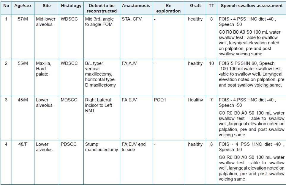 Head and neck cancers are managed by a multimodality approach. However, after oncologic resection, reconstruction should focus on restoring form and function. Herein, we report a series of 04 cases who underwent resection of oral cavity tumors followed by reconstruction with a free fibula osteocutaneous flap and its functional outcome.